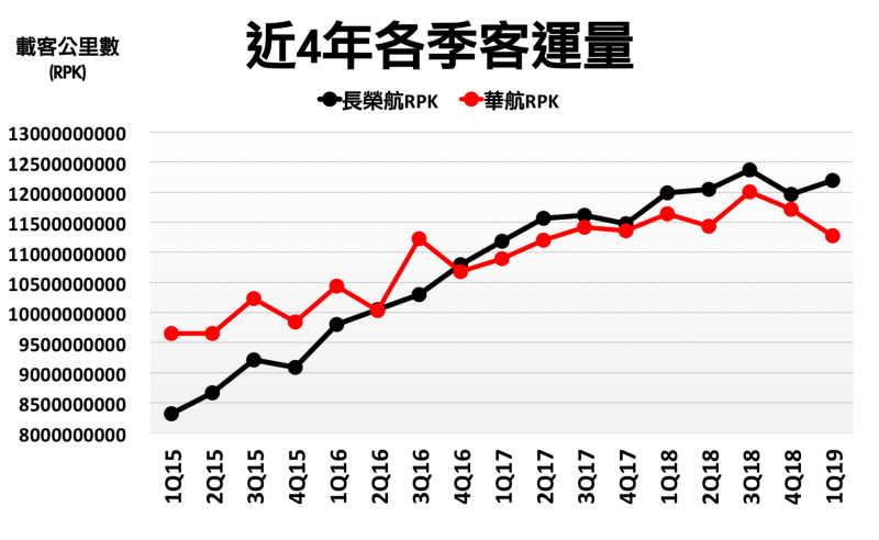 更進一步來看,民航局定期航期載客貨率資料顯示長榮航在2018年12月共有51條定期航線,平均載客率為83.14%,其中有37條航線載客率超過80%,更有8條航線超過90%。長榮航從2012年起近年載客人數逐年成長,載客率也一直都維持8成左右的高水平,載貨率也一直超過8成,皆高於國際航空運輸協會(IATA)公佈的全球損益載客貨運率水平(註),這代表整體勞動量持續增加,勞動強度也都在高檔。除此之外,長榮航的客運量(客運載客公里數, Revenue Passenger Kilometer, RPK)從2016年至2018年成長了18%,同時在2017年與2018年的各季客運量都超過華航(如下圖所示)。