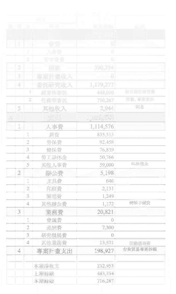 by 共力研究社 (TPEC) 2022 年 2 月 21 日 需要您的捐款支持財務現況說明截至2021年底,共力研究社的結餘約有20萬元 (可參閱下方報表),這是由於過去研究員一段時間無給薪,所以累積了一些存款。 現在共力研究社有三名專職研究員、一名特約研究員、一名兼職行政人員,目前僅三位專職研究員固定給薪。 支出方面: 目前主要支出為研究員的薪資與雜支。由於組織尚在茁壯階段,專職研究員僅以半薪給薪,含勞健保勞退每月合計約8萬元。若全薪每月應達16萬元左右。 收入方面: 目前固定的委託研究費為3.6萬元,再加上定期捐款1.4萬元,總計每月約5萬元收入。 小結: 所以目前只需募得每月3萬元,就可讓大家透過半薪的方式持續讓這個組織存活下去; 但若能募得每月11萬元,就可讓大家有個較合理的薪資,得以讓這個組織能更加有生產力與茁壯的發展。 捐款支持 0 K 每月募得初步目標 0 + 每月期望定捐人數 (初步) 0 K 每月募得進階目標 0 + 每月期望定捐人數 (進階)