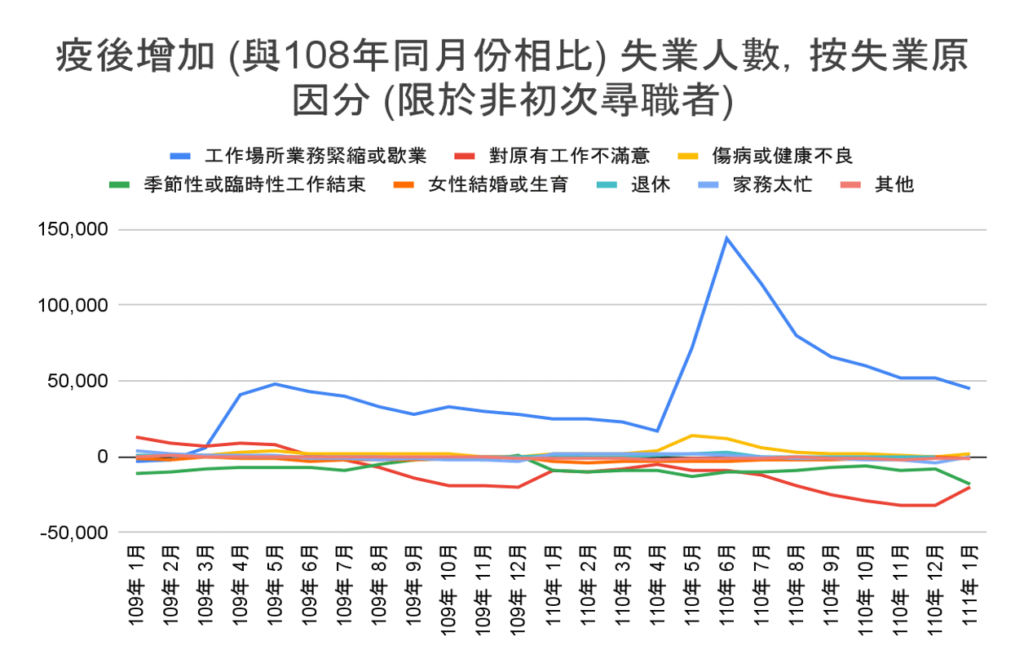 與工時縮減相似,增加的失業人數在達高峰後逐步下滑,但相對於工時縮減人數的變化,失業人數的縮減更為緩慢。即便到110年疫情爆發前,109年第一波疫情所導致的新增失業人數尚未消除。111年1月時,失業人數仍比108年1月多出45,000人。