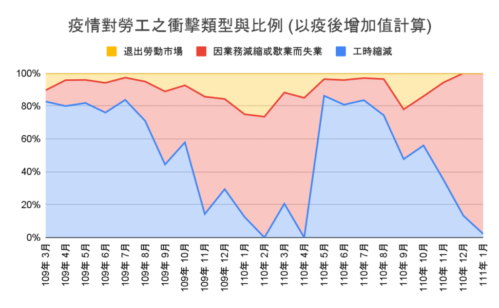 在兩波疫情高峰時,受疫情衝擊之勞工,約八成遭遇工時縮減,其餘兩成為失業或退出勞動市場。隨著疫情逐漸趨緩,失業問題仍持續存在,成為主要問題